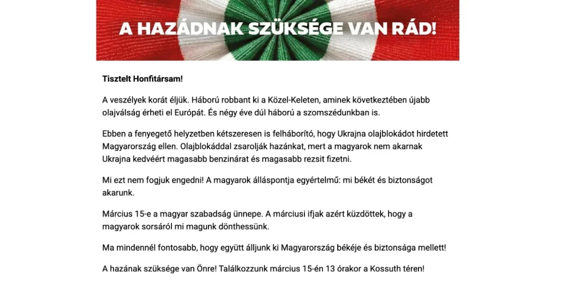 Orbán Viktor, Magyarország miniszterelnöke, figyelmeztető levelet küldött azoknak a polgároknak, akik korábban feliratkoztak az oltásokkal kapcsolatos információkra. A levélben azonban nem újabb járványról értesítette a címzetteket, hanem a jelenlegi háborús helyzetre, az olajárak megemelkedésére, valamint Ukrajna és az olajblokád kérdéseire hívta fel a figyelmet. A levél végén felszólította a címzetteket, hogy vegyenek részt a Kossuth téren tervezett miniszterelnöki beszéden, mondván, hogy ez a lépés hozza el a békét és a biztonságot az ország számára.